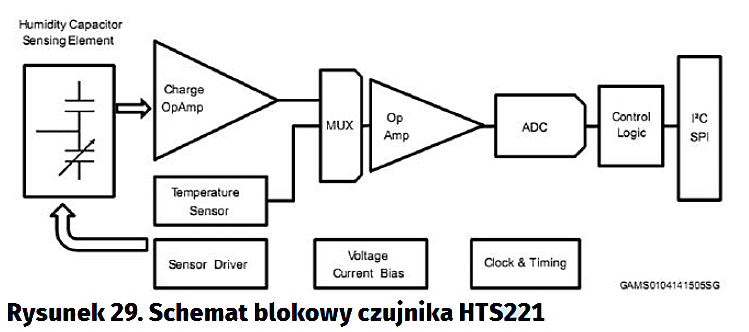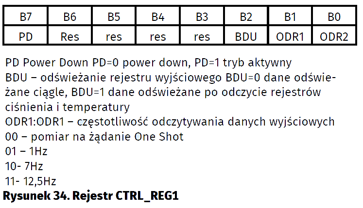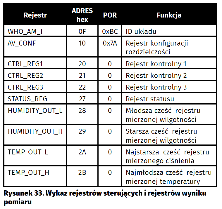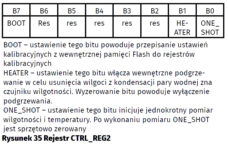 Wyzerowanie bitów ODR1 i ODR2 wprowadza układ w tryb pomiaru na żądanie. Żeby wyzwolić taki pomiar trzeba ustawić bit ONE_SHOT w rejestrze CTRL_REG2, jak pokazano na rysunku 35. Po wyzwoleniu pomiaru (również w trybie pomiaru ciągłego) trzeba testować czy wynik pomiaru został zapisany do rejestrów wyjściowych. Żeby to zrobić trzeba odczytać zawartość rejestru statusowego STATUS_REG. Ustawienie bitu H_DA (bit b1 STATUS_REG) oznacza, że wynik pomiaru wilgotności został zapisany do rejestrów wyjściowych HUMIDITY_OUT_L i HUMIDITY_OUT_H, a ustawienie bitu T_DA (bit b0 STATUS_REG) oznacza, że wynik pomiaru temperatury został wpisany do rejestrów pomiaru temperatury. Operacje zapisywania i odczytywania rejestrów są pokazane na listingach 20 i 21.
