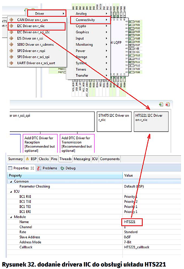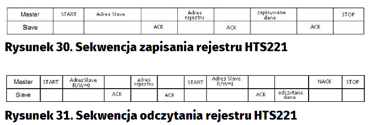 Zapisanie rejestru rozpoczyna się od wysłania przez mikrokontroler sekwencji START, a po niej adresu Slave 0x5F. Potwierdzenia adresu przez HTS221 pozwala na wysłanie przez mikrokontroler adresu rejestru, a po nim zapisywanej danej (rysunek 30). Odczytanie rejestru rozpoczyna się od wysłania sekwencji START i adresu Slave z bitem R/W=0 (zapis) i bajt adresu rejestru. Potem jest wysyłana powtórna sekwencja START, adres Slave z bitem R/W=1, a po nim odczytywany jest jeden bajt zawartości zaadresowanego rejestru (rysunek 31). Podobnie jak w przypadku termometru STML75 będziemy potrzebowali dodania i konfiguracji funkcji drivera IIC.