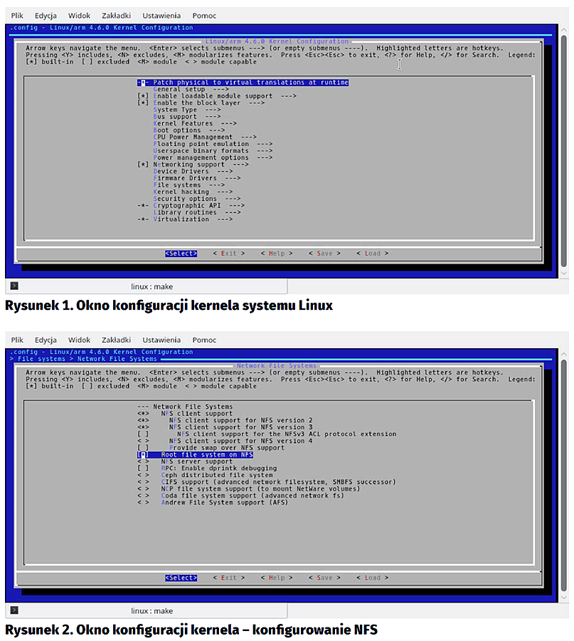 Powinno zostać wyświetlone okno, jak na rysunku 1. Używając klawiszy strzałek przechodzimy kursorem do menu File systems, wciskamy enter, a następnie do Network File Systems. Po ustawieniu w tym miejscu kursora wciskamy spację, aby w nawiasach kwadratowych obok napisu Network File Systems pojawiła się gwiazdka. Teraz możemy nacisnąć Enter i wejść do tego menu. Tam ustawiamy kursor na opcji NFS Client Support i dwukrotnie wciskamy spację. Po jednokrotnym kliknięciu spacji w nawiasie kwadratowym pojawi się literka M, oznaczająca, że dana funkcja zostanie skompilowana jako moduł jądra. My chcemy wkompilować obsługę NFS w samo jądro, więc musimy nacisnąć enter jeszcze raz, aby pojawiła się właśnie gwiazdka, oznaczająca wkompilowanie funkcji w jądro. Teraz przechodzimy do opcji Root file system on NFS i również klikamy spację dwa razy. Ekran na tym etapie powinien wyglądać jak na rysunku 2. Zapisujemy ustawienia, wciskając trzy razy strzałkę w prawo, co ustawi znajdujący się na dole kursor na opcji Save. Wciskamy trzykrotnie enter, aby zapisać ustawienia i to potwierdzić. Na koniec ustawiamy kursor w polu Exit i wciskamy enter, aby zamknąć program.