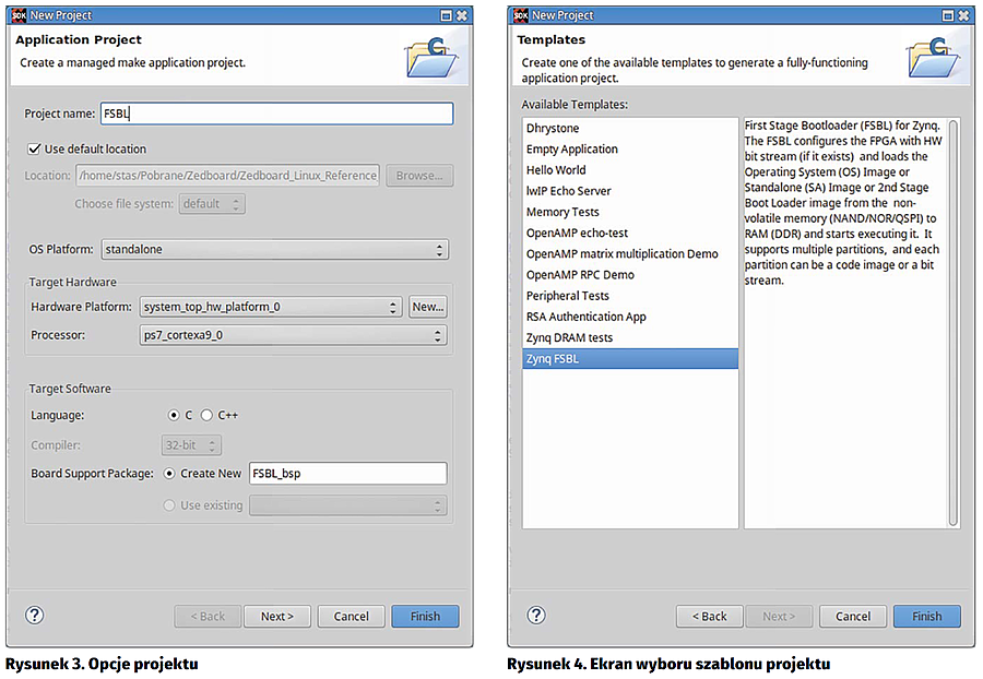 Do wygenerowania pliku BOOT.BIN potrzebne są trzy pliki: fsbl, bitstream i u-boot. Pierwszy z nich można łatwo wygenerować za pomocą XSDK. Po wyeksportowaniu zbudowanego w Vivado projektu (opis w poprzednim artykule) tworzymy w XSDK nowy projekt (menu File->New->Application Project). Wybieramy nazwę, np. FSBL i opcje jak na rysunku 3. Po kliknięciu next powinien się pojawić ekran z wyborem szablonu projektu (rysunek 4). Wybieramy szablon Zynq FSBL. Po kliknięciu Finish, czekamy aż XSDK zbuduje projekt i mamy gotowy FSBL.