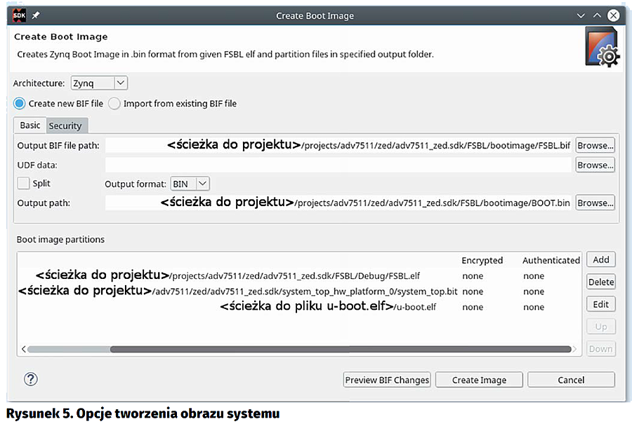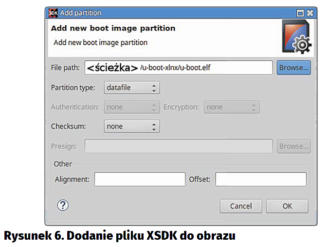 Plik bitstream był już wcześniej stworzony przez Vivado i powinien być w XSDK w projekcie system_top_hw_platform_0 (projekt ten jest tworzony po wyeksportowaniu projektu Vivado, opis również w poprzednim artykule). Plik u-boot został zbudowany w jednym z poprzednich kroków. Należy tylko zmienić mu nazwę, dodając rozszerzenie .elf, gdyż wymaga tego narzędzie generujące plik BOOT.bin. Jesteśmy zatem gotowi do wygenerowania pliku BOOT.bin. W tym celu należy zaznaczyć kliknięciem utworzony projekt FSBL, a następnie z menu Xilinx Tools wybrać Create Boot Image. W oknie, które zostanie wyświetlone (rysunek 5), powinny być już wypełnione niektóre pola. Do listy plików obrazu automatycznie dodaje się zarówno plik FSBL, jak i bitstream, ale nie ma w nim plik u-boot.elf, gdyż XSDK nie zna jego lokalizacji. Dodajemy go klikając Add i wpisując ścieżkę do pliku u-boot.elf, jak na rysunku 6. Klikamy OK, a następnie Create Image. Po kliku chwilach powinniśmy mieć gotowy obraz. Znajdziemy go w folderze projects/adv7511/zed/adv7511_zed.sdk/FSBL/bootimage/.