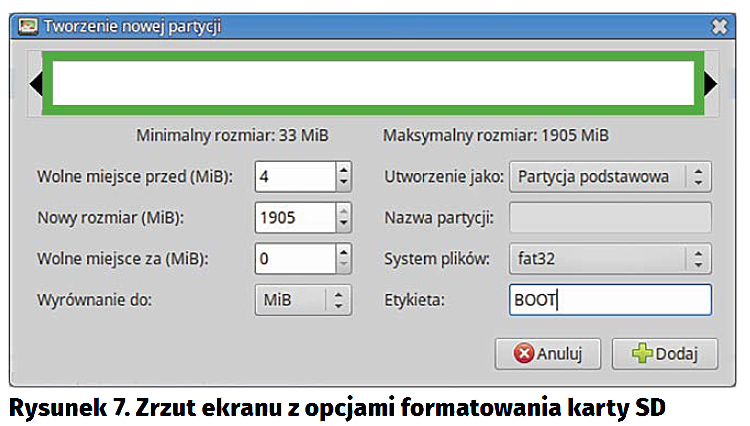 Najpierw trzeba sformatować kartę. Pierwszy sposób zakłada, że na karcie jest jedna partycja sformatowana jako fat32. Można nadać jej etykietę BOOT. Polecam użyć do tego programu Gparted. Na rysunku 7 pokazano zrzut ekranu z oknem opcji formatowania karty. W tym przykładzie karta ma 2 GB pojemności, w wypadku karty o większej pojemności należy zwiększyć rozmiar partycji. Po sformatowaniu karty kopiujemy niezbędne pliki: BOOT.bin (z projektu FSBL), uImage (jądro Linuksa, znajduje się w folderze linux/arch/arm/boot), devicetree.dtb (folder dts/clean) i plik core-image-minimal-zedboard-zynq7-<znacznik czasowy wygenerowania>.rootfs.cpio.gz.u-boot (folder yocto/poky/zedboard/tmp/deploy/images/zedboard-zynq7). Nazwę ostatniego z plików należy zmienić na uramdisk.image.gz. Po skopiowaniu plików odmontowujemy kartę i podłączamy do płytki. Przed włączeniem płytki należy podłączyć ją do komputera przez USB. Na płytce podłączamy kabel do złącza USB podpisanego jako UART.