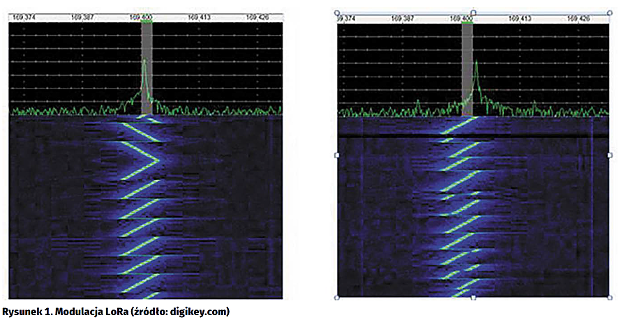 Na powyższych założeniach oparta jest m.in. modulacja CSS (Chirp Spread Spectrum), w której strumień danych modulowany jest sygnałem o liniowo wzrastającej częstotliwości. Na tej technice bazuje modulacja LoRa, której zarejestrowany spektrogram został przedstawiony na rysunku 1. Z lewej strony pokazana została tzw. preambuła, niezawierająca danych, na której widać w jaki sposób wygląda sygnał modulujący, którego zakres częstotliwości definiuje szerokość pasma. Zmodulowany sygnał został przedstawiony na przebiegu po prawej stronie.
