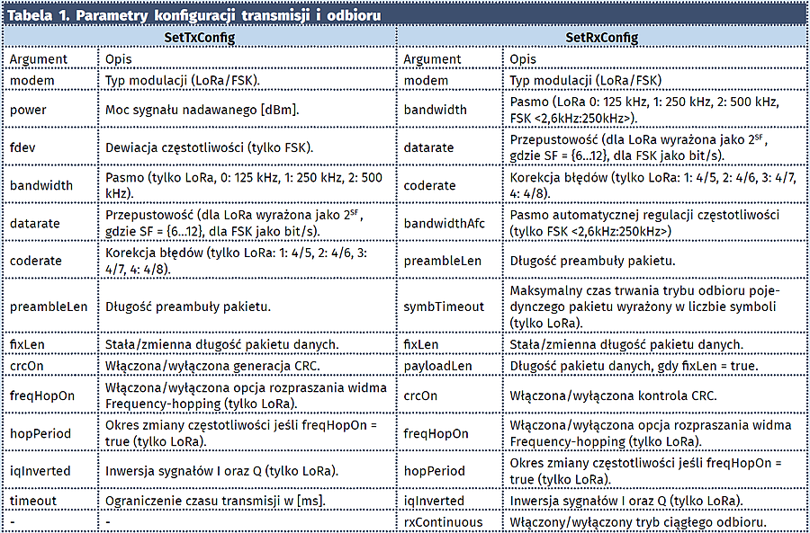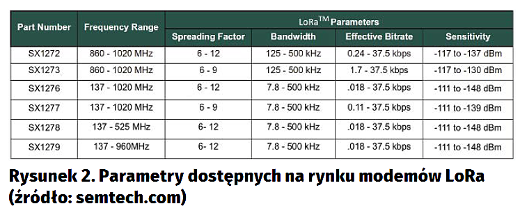 Rodzinę dostępnych na rynku modemów LoRa można podzielić na dwie grupy. Pierwsza z nich obejmuje układy SX1272 i SX1273, które są przystosowane do pracy z częstotliwościami z zakresu 860..1020 MHz. Druga grupa to układy SX1276, SX1277, SX1278 i SX1279 mogące pracować z częstotliwościami od 137 do 1020 MHz, zależnie od modułu. W porównaniu do układów z pierwszej grupy mają one większą czułość odbiorników radiowych, a ich pasmo zaczyna się już od 7,8 kHz, w przeciwieństwie do pierwszej grupy modemów, gdzie dopuszczalne pasmo zaczyna się od 125 kHz. Na rysunku 2 można zobaczyć dokładne parametry poszczególnych modułów zaczerpnięte z oficjalnej dokumentacji firmy Semtech.