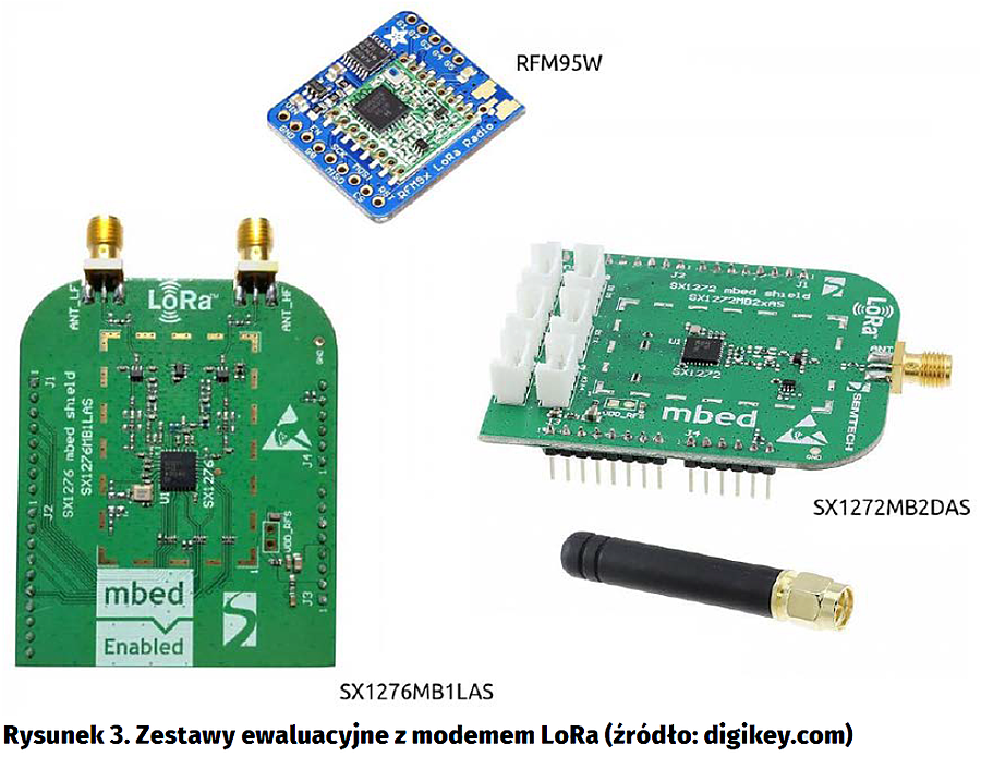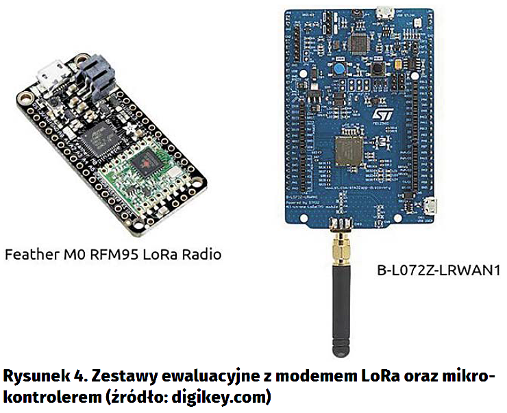 W drugiej grupie zestawów ewaluacyjnych znajdują się moduły, które oprócz modemów LoRa zawierają mikrokontrolery, dzięki czemu nie wymagają dołączania zewnętrznych układów przed rozpoczęciem pracy. Przykładami takich układów są (rysunek 4):