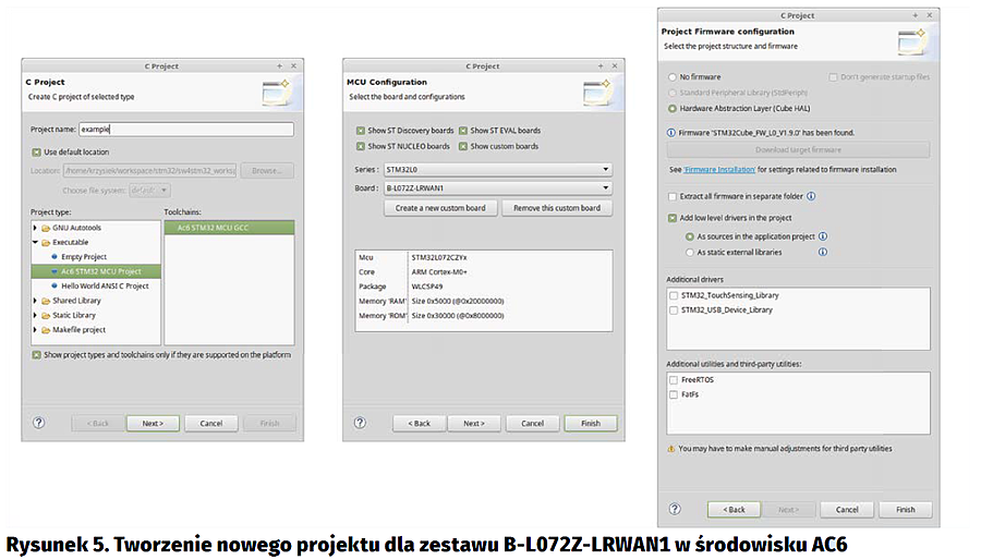 Pracę zaczynamy od utworzenia nowego projektu dla zestawu B-L072Z-LRWAN1 - kolejne kroki z wymaganymi opcjami zostały przedstawione na rysunku 5. W ostatnim z przedstawionych okien należy pobrać bibliotekę STM32Cube i dodać ją do źródeł projektu. W projekcie potrzebne też będą elementy rozszerzenia I-CUBE-LRWAN: