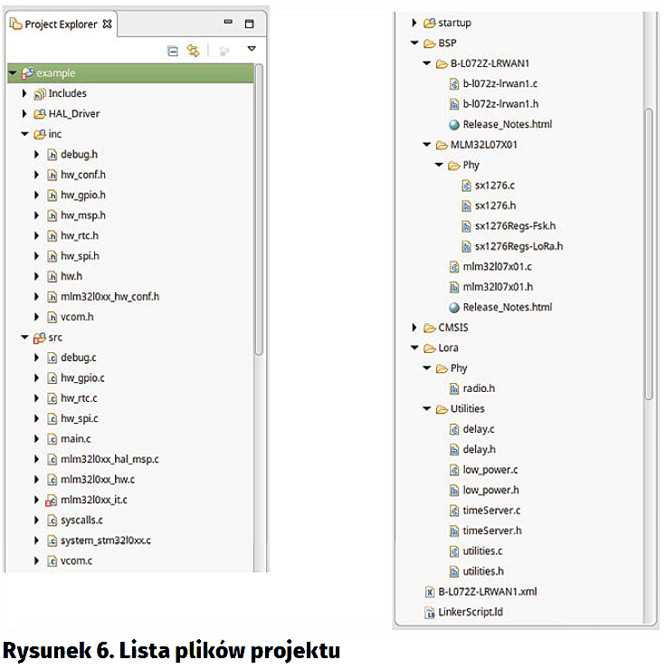 Powyższe moduły wymagają dostarczenia funkcji obsługi takich peryferiów jak GPIO, RTC i SPI. Znajdują się one w przykładach aplikacji dołączonych do zestawu B-L072Z-LRWAN1. Do opisywanego przykładu zostały dołączone pliki z aplikacji Projects/Multi/Applications/LoRa/PingPong: debug.c, debug.h, hw.h, hw_conf.h, hw_msp.h, hw_gpio.c, hw_gpio.h, hw_rtc.c, hw_rtc.h, hw_spi.c, hw_spi.h, mlm32l0xx_hal_msp.c, mlm32l0xx_hw.c, mlm32l0xx_hw_conf.h, mlm32l0xx_it.c, vcom.c, vcom.h.