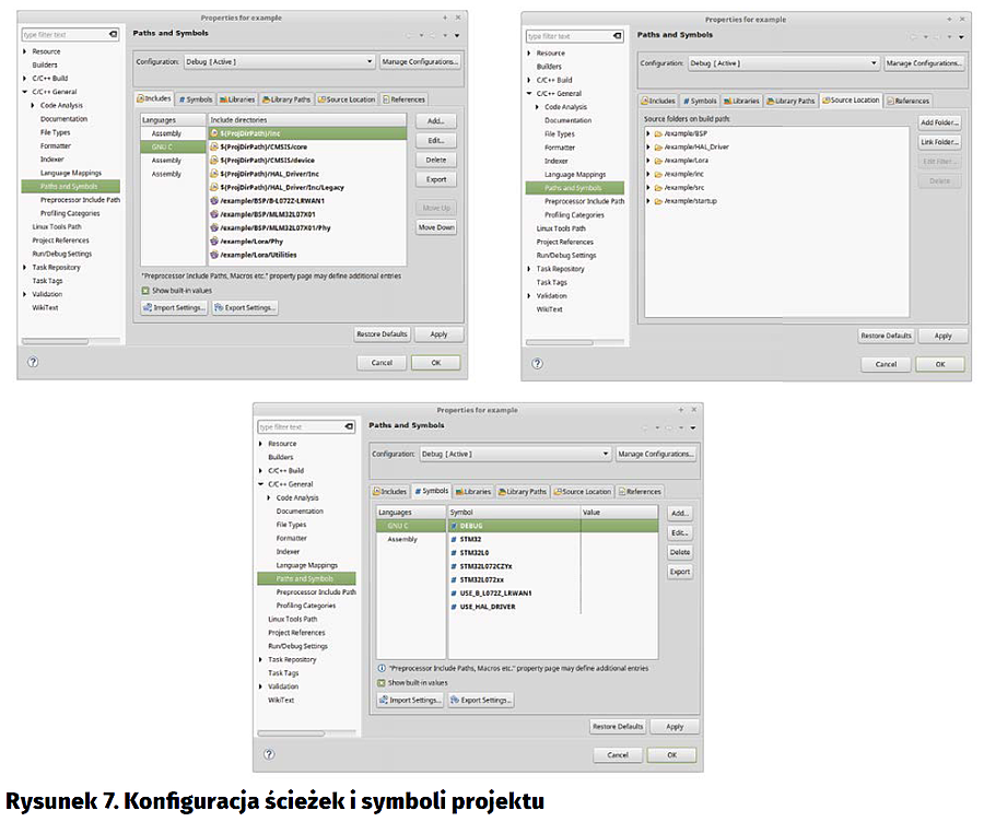 Po dodaniu wszystkich źródeł trzeba uzupełnić ścieżki w projekcie. Można to zrobić w ustawieniach projektu: C/C++ General Paths and Symbols. W zakładce Includes należy dodać ścieżki do nagłówków, a w zakładce Source Location ścieżki do plików źródłowych. Przy dodawaniu ścieżek warto zaznaczyć opcje dodania ich do wszystkich konfiguracji. Rozszerzenie I-CUBE-LRWAN potrzebuje do poprawnego działania także odpowiednich symboli - podobnie jak w przypadku ścieżek warto dodać je do wszystkich języków i konfiguracji. Wszystkie ustawienia zostały przedstawione na rysunku 7.