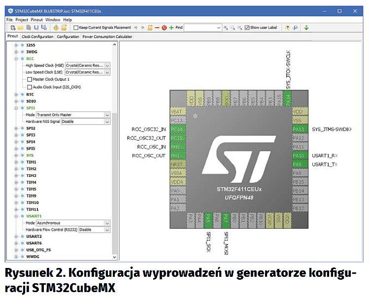 Oprócz modułu SPI uruchamiamy również interfejs UART. Możemy wybrać dowolny moduł – USART1, USART2 lub USART6. W przykładzie użyto USART1 na pinach PA10 (RX) i PA9 (TX). Konfigurację wyprowadzeń w STM32CubeMX pokazano na rysunku 2.