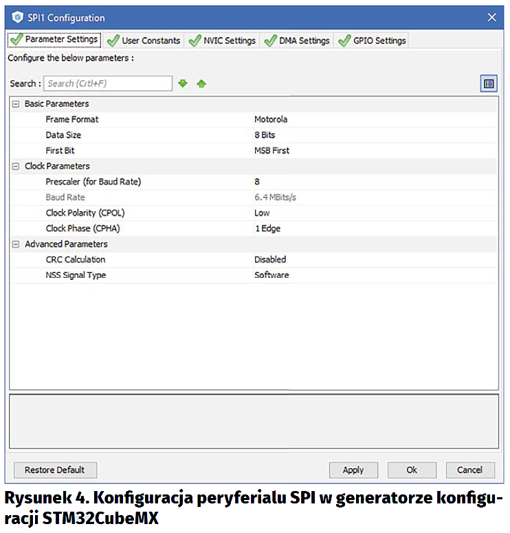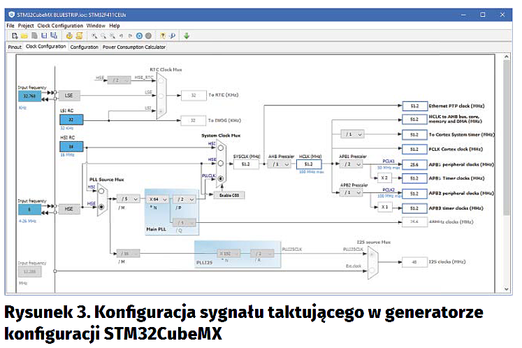 W zakładce „Clock Configuration” zwyczajowo ustawiamy częstotliwość pracy wejściowego oscylatora kwarcowego (u mnie 8 MHz), przełączamy źródło sygnału podawanego na główną pętlę PLL – „PLL Source Mux” na „HSE”, jako źródło sygnału taktującego dla całego układu wybierzmy pętlę PLL – przełącznik „System Clock Mux” ustawiamy na pozycję „PLLCLK”. Teraz musimy jeszcze ustawić pożądaną częstotliwość taktowania naszego układu. Nie będzie to jednak maksymalna, dozwolona wartość. Musimy dobrać ją wspólnie z dzielnikiem częstotliwości taktującej interfejs SPI, aby możliwa była transmisja sygnału „jedynki” i „zera” dla diod w odpowiednim czasie. Robimy to identycznie. jak opisano w EP 3/2017, ponieważ transmisja pojedynczego bitu sygnału sterującego diodami trwa 1,25 ms, a jego sygnał jest generowany przez 8 bitów nadawanych interfejsem SPI. Każdy taki bit powinien trwać 0,15625 ms, co przekłada się na częstotliwość taktowania peryferialu SPI równą 6,4 MHz. Aby uzyskać taką wartość, ustawiamy wartość częstotliwości „HCLK (MHz)” na 51,2 MHz oraz wartość dzielnika, w kolejnym etapie konfiguracji na 8 (rysunek 3).