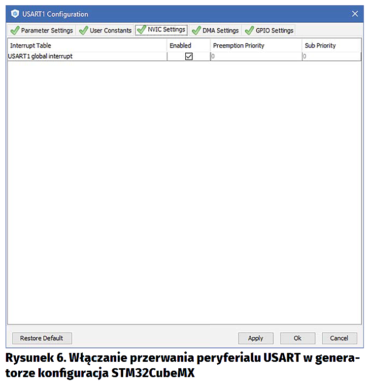 Teraz przechodzimy do konfiguracji UART. Ponownie z pola „Connectivity” wybieramy pozycję „USARTx”. Tym razem jednak musimy zmienić inny parametr – „Baud Rate”. W tym polu wprowadzamy „9600 Bits/s” (rysunek 5). Następnie, nie wychodząc z okna konfiguracji peryferialu USART, przechodzimy do zakładki „NVIC Settings” i zaznaczamy tam jedyne znajdujące się na liście przerwanie (rysunek 6). Zatwierdzamy zmiany przyciskiem „OK”.