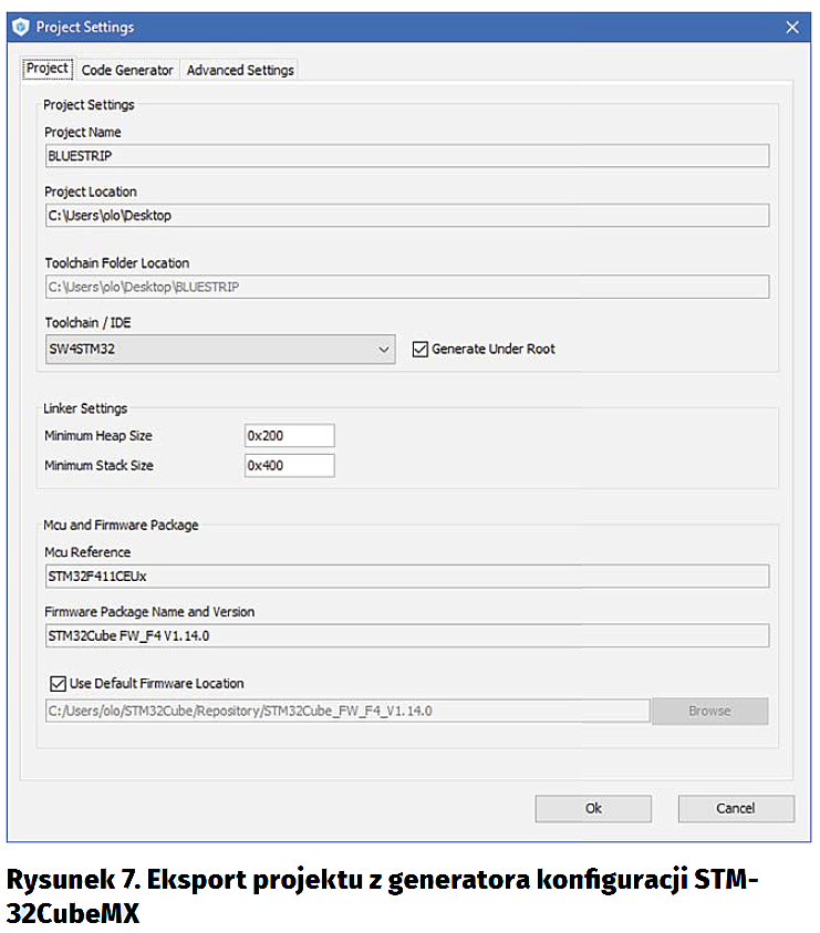 Na tym etapie możemy już zapisać ustawienia i wygenerować projekt, a następnie zaimportować go w środowisku IDE w sposób opisany w poprzednich artykułach – klikamy ikonę zębatki na pasku narzędziowym, wybieramy w polu „Toolchain / IDE” opcję „SW4STM32” i zapisujemy pliki projektu w wybranym miejscu (rysunek 7). Następnie otwieramy IDE System Workbench for STM32, zamykamy planszę powitalną (X), w ramce „Project Explorer” klikamy prawym przyciskiem myszy i z menu kontekstowego wybieramy opcję „Import...”, w nowym oknie, klikamy kolejno: „General”, „Existing Projects into Workspace”, „Next”, wybieramy lokalizację plików projektu oraz zatwierdzamy import przyciskiem „Finish”.