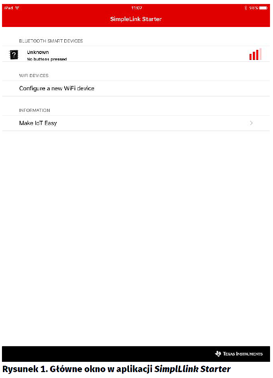 Uruchom aplikację SimpleLink Starter na swoim urządzeniu mobilnym. Może to wymagać włączenia na urządzeniu radia Bluetooth. Aplikacja najlepiej działa na iPadzie. W przypadku Androida można spotkać się z kłopotami i ograniczeniami funkcjonalności.