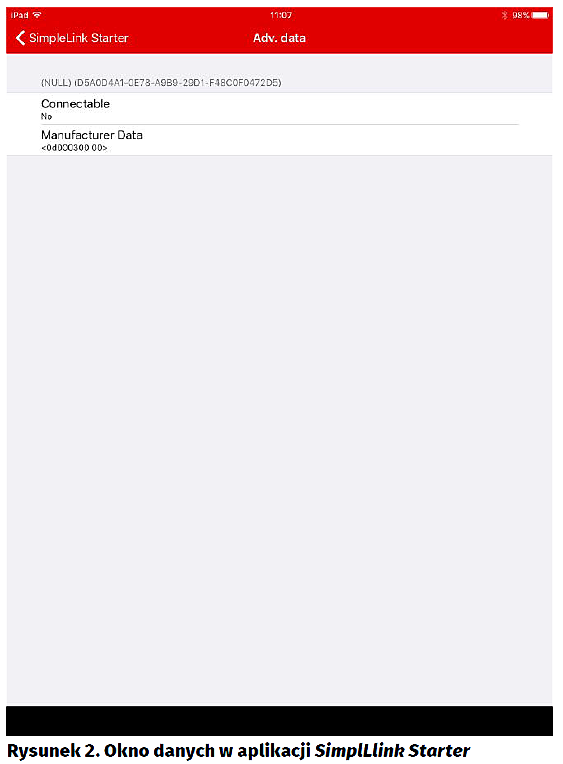 Kliknij na linię nazwy i wybierz Adertisement Data. Zostanie wyświetlone okno prezentujące bieżące wartości odczytu z zestawu (rysunek 2).