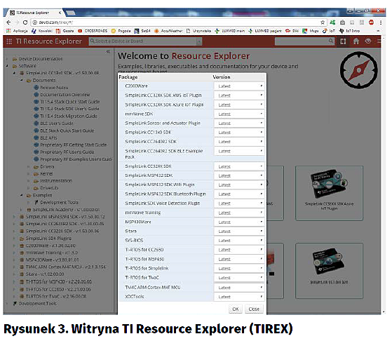 W witrynie TI Resource Explorer są obecnie zgromadzone (prawie wszystkie) informacje i źródła dotyczące procesorów komunikacyjnych rodziny CC13x0 [11]. Daje to pełny i uporządkowany dostęp do zasobów w aktualnych wersjach (domyślnie). Jest także umożliwiony dostępu do ich poprzednich wersji. W menu strony należy kliknąć na ikonkę Package Picker. Zostaje rozwinięta lista pakietów programowych (rysunek 3). Typowo jest wybrana ostatnia wersja (Latest). Po wybraniu archiwalnej wersji i kliknięciu na przycisk OK pokazywana jest wybrana wersja. Jej ikonka jest specjalnie zaznaczona.