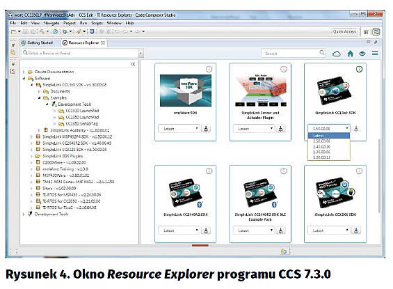 Okno Resource Explorer w programie CCSv7.3 realizuje dostęp do witryny TI Resource Explorer. Najlepiej go otwierać poprzez panel Getting Started, używając przycisku Browse Examples [10]. Uruchomienie tego okna z menu View Resource Explorer często powoduje kłopoty. Typowo zgłasza on problem połączenia z portalem TI po pierwszej próbie. Czasami pomaga zamknięcie tego okna i ponownie jego uruchomienie.