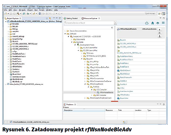 Pakiet programowy SDK oferuje wersje projektów dla trzech typów zestawów sprzętowych z wyborem dwóch typów kompilatorów. W wypadku stosowania jako węzeł Node zestawu sprzętowego CC1350 Launchpad w oknie Resource Explorer rozwiń ścieżkę (rys. 5): Software SimpleLink CC13x0 SDK – v:1.50.00.08 Examples Development Tools CC1350 Launchpad EasyLink rfWsnNodeBleAdv TI-RTOS CCS Compiler rfWsnNodeBleAdv. W prawym panelu okna Resource Explorer kliknij na ikonkę CCS – operacja Import to IDE.