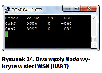 Sytuacja z dwoma wykrytymi węzłami Node sieci WSN jest pokazana na rysunku 13 i rysunku 14. Drugi węzeł pracuje z zestawem CC1350 SensorTag. Wyłączenie i ponowne włączenie zasilania węzła Node powoduje wygenerowanie jego nowego identyfikatora ID (adresu). Węzeł koncentratora dodaje go do listy sieci. Pomimo braku komunikacji z węzłem o poprzednim identyfikatorze jest on dalej wyświetlany na liście węzłów sieci WSN. Przykłady budowy dwupasmowej sieci WSN z zastosowaniem zestawu CC1350 Launchpad (oraz CC1350 SensorTag) są bardzo ciekawe i dobrze pokazują, w którą stronę może pójść rozwój sieci Internetu Rzeczy. Zagadnienie jest młode i na obecnym etapie cierpi na chorobę częstych i nagłych zmian.