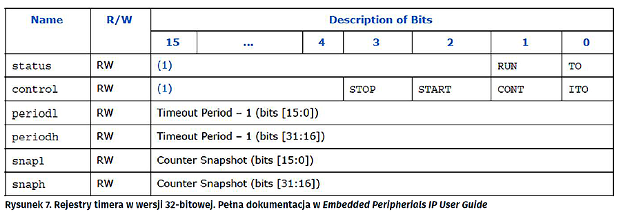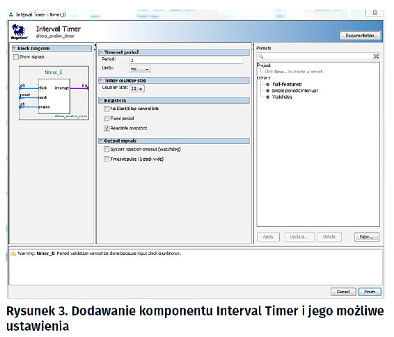 Timeout Period: Period, Units – definiujemy tu wartość, jaka ma być ładowania do timera po zakończeniu odliczania, oraz jednostki, w jakich jest ona wyrażona (jeśli wszystko wykonujemy poprawnie, Qsys wie, jaka jest częstotliwość zegara i jest w stanie przeliczyć czas na liczbę cykli zegara – to bardzo wygodne). W skrócie definiujemy tu okres, z jakim licznik będzie nas powiadamiał o zakończeniu odmierzania czasu.