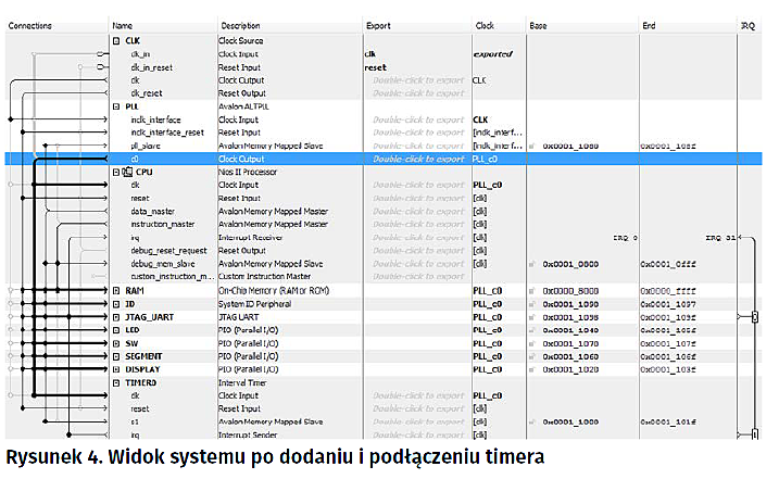 W czasie tego spotkania nasz system wzbogaciliśmy o timer, który może generować przerwania. Dowiedzieliśmy się o jego działaniu a także o działaniu systemu przerwań, po czym uruchomiliśmy odświeżanie wyświetlaczy LED działające właśnie w przerwaniu. Czas teraz na kolejną porcję zadań (programistycznych) do realizacji (bez zmian w Qsys):