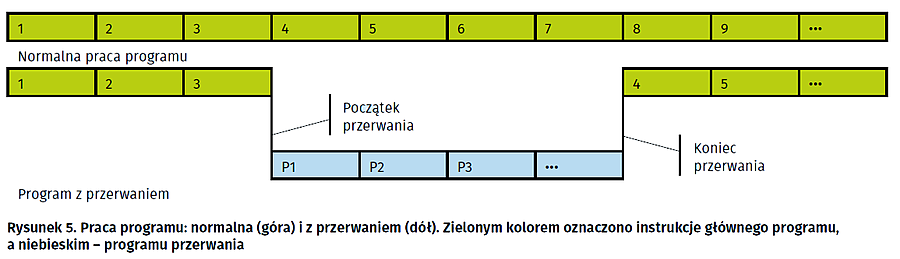 Normalnie program w naszym procesorze jest wykonywany krok po kroku, a instrukcje są realizowane po kolei (za wyjątkiem skoków związanych np. z pętlami czy instrukcjami warunkowymi). Czasem jednak jest wymagane obsłużenie nagłego zdarzenia (np. wciśnięcie przycisku bezpieczeństwa, odebranie danych przesłanych jakimś interfejsem). W tym właśnie celu używa się przerwań, które w określonej sytuacji powodują przerwanie (jak sama nazwa wskazuje) wykonywania głównego programu i wykonanie innych, „priorytetowych” zadań. Po tym wszystkim zwykle następuje powrót do wykonywania głównego programu od miejsca, w którym został on przerwany. Przedstawia to schematycznie rysunek 5.