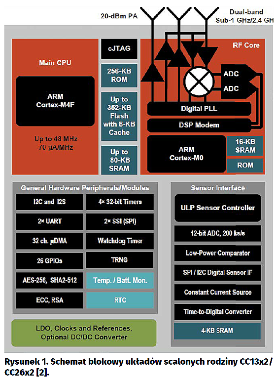 Układy CC2652R1F mają nowy rdzeń główny ARM Cortex-M4F (zamiast Cortex-M3) oraz powiększoną pamięć Flash do 352 kB (zamiast 128 kB) oraz pamięć RAM do 80 kB (zamiast 28 kB) [9]. Jest to bardzo duża zmiana jakościowa (rysunek 1). Nowy rdzeń ma bardzo rozbudowane mechanizmy sprzętowe debugowania i śledzenia.