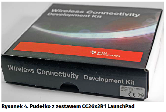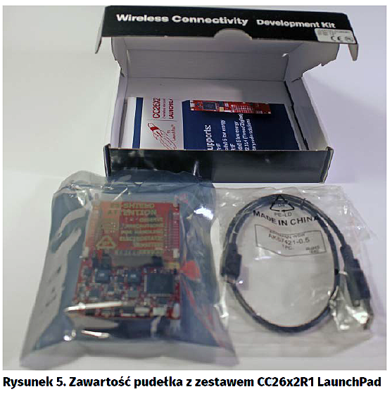 Podobnie jak w wielu portalach społecznościowych zobaczmy jak nowy zestaw „wychodzi z pudełka” (początek 12.2017). Zestaw CC26x2R1 LaunchPad jest zapakowany w pudełko większe niż poprzednie zestawy platformy SimpleLink (rysunek 4). Jest to związane z większym rozmiarem następnego nowego zestawu CC1352R1 LaunchPad. Jego opis już można zobaczyć w pliku Board.html w ścieżce C:tisimplelink_cc26x2_sdk_0_95_00_14sourcetiboardsCC1352R1_LAUNCHXL pakietu programowego SIMPLELINK-CC26X2-SDK. Nalepka na pudełku podaje typ, wersję sprzętową i programową (rysunek 4). Wewnątrz pudełka znajdziemy (rysunek 5):