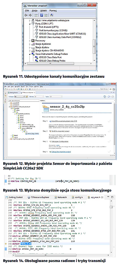 Podstawowe informacje o projekcie Sensor pakietu SimpleLink CC26x2 SDK są umieszczone w pliku README.html w ścieżce C:tisimplelink_cc26x2_sdk_0_95_00_14examplesrtosCC26X2R1_LAUNCHXLti154stacksensor. W projekcie i opisie stosowane są inne nazwy diod LED i przycisków niż w opisie na płytce zestawu CC2652R1 LaunchPad. Są to nazwy symboli, i tak: przycisk Board_BUTTON0 – to lewy BTN-1, przycisk Board_BUTTON1 – to prawy BTN-2, dioda Board_LED0 – to lewa dioda red, dioda Board_LED1 – to prawa dioda green.