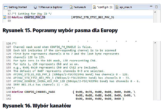W instrukcji warsztatu Sensor and Collector – TI 15.4-Stack Project Zero pokazują też jak wybrać określone kanały pasma [12]. W projektach Sensor i Collector pakietu SIMPLELINK-CC26X2-SDK maska kanałów jest ustawiona na wybór kanałów 11 do 14 (rysunek 16) [9]. Jest to bardzo dobre ustawienie do rozpoczęcia pracy.
