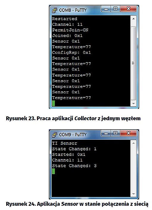 W testowanej aplikacji Collector została dodana linia wyświetlania transmitowanej przez węzeł Sensor temperatury (rysunek 23). Prawa zielona dioda LED błyska przy każdej transmisji danych. I wyświetlane są nowe przetransmitowane dane.