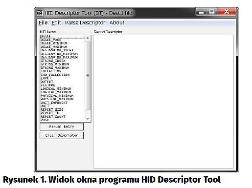 Na stronie USB Implementers Forum pod adresem https://goo.gl/8c7VqX można znaleźć dokumentację klasy HID oraz program HID Descriptor Tool (rysunek 1), który umożliwia tworzenie deskryptorów raportów w środowisku graficznym przy pomocy zrozumiałych dla człowieka nazw, a następnie wygenerowanie na ich podstawie zawartości deskryptora raportu w postaci wektora wartości heksadecymalnych.