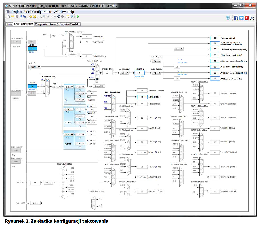 Interfejs USB wymaga taktowania stałą częstotliwością, przy zachowaniu dokładności nie gorszej niż 0.5%. Istotna jest więc poprawna konfiguracja taktowania mikrokontrolera. Peryferiale USB stosowane w mikrokontrolerach STM32 wymagają taktowania częstotliwością 48 MHz, która może być różna od częstotliwości taktowania rdzenia mikrokontrolera. Poszczególne serie rodziny STM32 różnią się istotnie możliwościami generowania przebiegów zegarowych, w tym możliwymi sposobami uzyskania przebiegu zegarowego dla peryferiala USB. W większości płytek serii Discovery i Nucleo do mikrokontrolera jest doprowadzony przebieg zegarowy o częstotliwości 8 MHz, generowany przez interfejs ST-Link. Nie dotyczy to jednak płytki NUCLEO-L476RG. Najprostszym sposobem na uzyskanie precyzyjnego taktowania mikrokontrolera na tej płytce jest użycie wewnętrznego generatora MSI o niskiej precyzji, synchronizowanego generatorem LSE, korzystającym z oscylatora „zegarkowego” 32768 Hz. Poniżej zostanie opisany sposób uzyskania takiej właśnie konfiguracji taktowania.