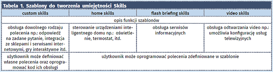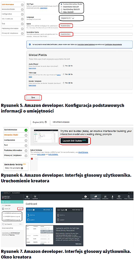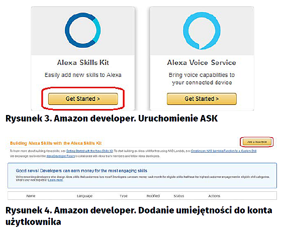 Po zalogowaniu się z dostępnych opcji wybieramy zakładkę Alexa (rysunek 2). Następnie mamy do wyboru dwa pluginy: Alexa Skills Kit oraz Alexa Voice Service. Ponieważ będziemy tworzyć umiejętności, to wybieramy Alexa Skills Kit (rysunek 3). Uruchamiane jest okno z informacjami o umiejętnościach przypisanych do konta użytkownika. My jeszcze nie mamy zdefiniowanych umiejętności i dane nie są uzupełnione. Żeby rozpocząć tworzenie umiejętności, z dostępnych opcji wybieramy Add a New Skill (rysunek 4). W przeglądarce jest uruchamiany kreator tworzenia umiejętności. W pierwszym kroku uzupełniamy informacje o tworzonej umiejętności. Wybieramy rodzaj umiejętności (szablon Custom Interaction Model – opcja domyślna) oraz podstawowy język, w którym umiejętność będzie obsługiwana (język angielski amerykański – opcja domyślna). Następnie, wprowadzamy nazwę umiejętności oraz komendę głosową do jej uruchomienia (maksymalnie do 3 słów). Po zakończeniu konfiguracji zatwierdzamy ustawienia (rysunek 5).