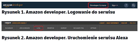 Interfejs głosowy użytkownika tworzymy z użyciem portalu developera. Uruchamiamy stronę internetową http://developer.amazon.com, wybieramy uruchomienie konsoli zarządzania i logujemy się do portalu (rysunek 1). Jeśli nie mamy konta w portalu developera, to należy się zarejestrować.