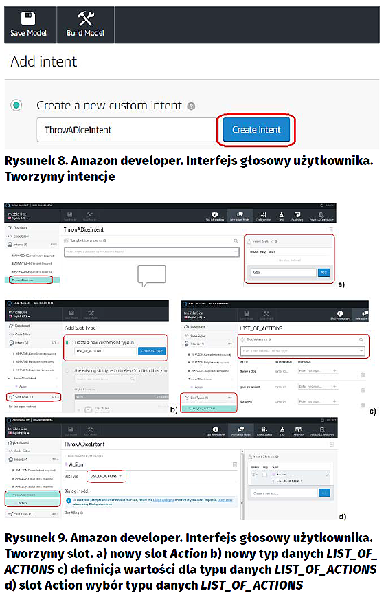 Po uruchomieniu mamy zdefiniowane intencje: Cancel, Help, Stop. Korzystając z funkcji Add w zakładce Intents możemy dodawać własne definicje (rysunek 7). Dodamy intencję, w której oprogramujemy akcję rzutu kostką. W tym celu, z zakładki Intents wybieramy przycisk Add. Następnie wprowadzamy nazwę tworzonej intencji ThrowADiceIntent i zatwierdzamy wybór przyciskiem Create Intent (rysunek 8). W kolejnym kroku definiujemy komendy głosowe, które będą uruchamiały intencję. Żeby ułatwić budowanie wypowiedzi utworzymy nowy Slot. W naszym wypadku będzie to slot o nazwie Action, który użyjemy do zdefiniowania wypowiedzi określających akcję rzutu kostką. W tym celu w oknie kreatora zaznaczamy utworzoną intencję ThrowADiceIntent oraz korzystając z dostępnych funkcji kreatora tworzymy slot o nazwie Action (rysunek 9a). Następnie definiujemy nowy typ danych LIST_OF_ACTIONS, z którego będzie korzystał slot Action (rysunek 9b). Po utworzonego typu danych wprowadzamy wypowiedzi opisujące akcję rzutu kostką. W naszym przypadku są to frazy: throw a dice, give me a result, roll a dice (rysunek 9c). Gdy mamy już utworzony Slot oraz typ danych z wypowiedziami, to łączymy oba elementy ze sobą. Żeby to zrobić, w opcjach konfiguracyjnych slotu Action zaznaczamy użycie typu danych LIST_OF_ACTIONS (rysunek 9d).