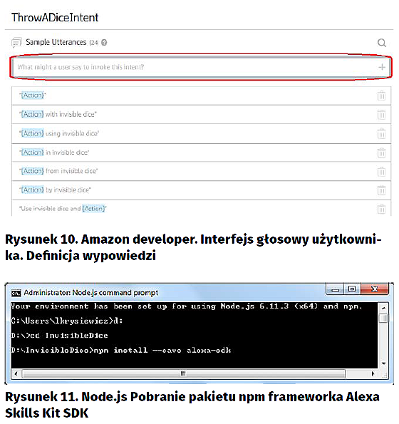 Najpierw przygotujemy środowisko uruchomieniowe dla JavaScript: Node.js. Uruchamiamy stronę nodejs.org dedykowaną dla projektu Node.js pobieramy, a następnie instalujemy oprogramowanie. Po zainstalowaniu środowiska uruchamiamy linię komend Node.js command prompt oraz przechodzimy do katalogu projektu (u nas to folder InvisibleDice utworzony na partycji D). Następnie, korzystając z wbudowanego w środowisko Node.js menedżera pakietów npm pobieramy framework Alexa Skills Kit SDK. Zestaw komend użytych do pobrania frameworka prezentuje rysunek 11.