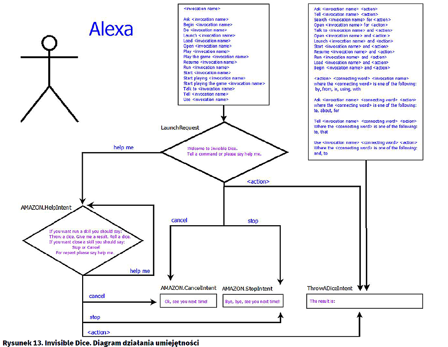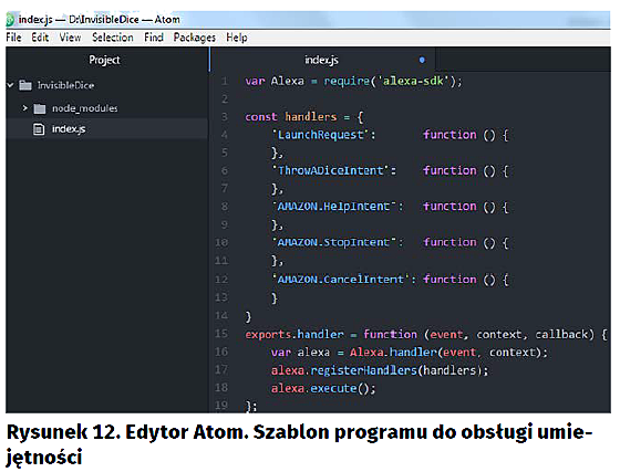 Edytor Atom pobieramy ze strony atom.io. Instalujemy a następnie uruchamiamy oprogramowanie. Po uruchomieniu edytora otwieramy folder InvisibleDice (File Open Folder), w którym znajdują się pliki frameworka. Następnie tworzymy nowy plik (File New File) i zapisujemy plik w folderze projektu (File Save) nadając mu nazwę index.js. W pliku index.js umieszczamy kod programu do obsługi umiejętności. Na początku programu inicjujemy użycie frameworka Alexa Skills Kit SDK for Node.js. Następnie, piszemy kod programu do obsługi intencji. Na zakończenie rejestrujemy użycie intencji oraz uruchomiamy frameworka. Wygląd szablonu programu do obsługi umiejętności asystentki Alexa pokazano na rysunku 12.