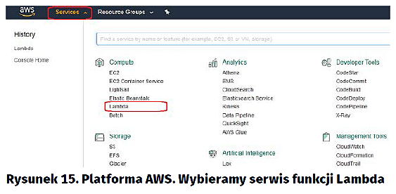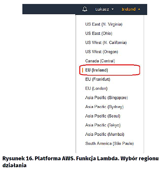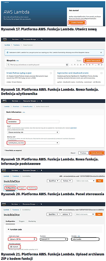 Po zarejestrowaniu konta na platformie AWS logujemy się do serwisu. Uruchamiamy stronę http://aws.amazon.com i z zakładki My Account wybieramy opcję AWS Management Console (rysunek 14). Następnie, podajemy nazwę użytkownika i hasło. Po zalogowaniu się uruchamiamy zakładkę Services, a następnie odnajdujemy i wybieramy funkcję Lambda (rysunek 15). W kolejnym kroku wybieramy region geograficzny, w którym będą znajdowali się odbiorcy naszej funkcji. Do wyboru mamy dwa obszary: US East (N. Virginia) i EU (Ireland) (tylko w tych centrach danych funkcja Lambda obsługuje Alexa Skills Kit). W naszym przypadku wybieramy region przeznaczony dla Europy (rysunek 16). Następnie przechodzimy do tworzenia nowej funkcji Lambda. W oknie głównym serwisu AWS zaznaczamy opcję Create a function (rysunek 17). Uruchamiane jest okno, w którym są prezentowane gotowe szablony dla funkcji Lambda. My wybieramy opcję tworzenia funkcji od podstaw Author from scratch (rysunek 18). Wprowadzamy nazwę funkcji (InvisibleDice), definiujemy uprawnienia (rola lambda_basic_execution) oraz zatwierdzamy utworzenie funkcji (rysunek 19). W systemie zostaje utworzona funkcja Lambda.