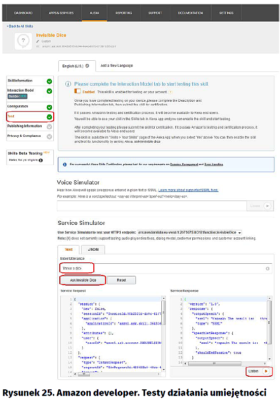 Przechodzimy do kolejnego etapu tworzenia umiejętności dla asystentki głosowej Alexa. Mamy już zdefiniowany interfejs głosowy użytkownika. Napisaliśmy oprogramowanie do obsługi umiejętności. Połączyliśmy oba elementy ze sobą. Teraz przetestujemy działanie umiejętności. Testy wykonamy korzystając z portalu developera (można skorzystać z platformy AWS i przeprowadzić testy działania funkcji Lambda). W oknie kreatora umiejętności wybieramy opcję Test. Dla każdej z utworzonych intencji wprowadzamy zdefiniowane wypowiedzi i weryfikujemy czy odpowiedź asystentki Alexa jest poprawna (rysunek 25). Po zakończeniu testów przechodzimy do publikacji umiejętności.
