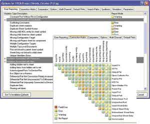 W środowisku Altium Designer proces kompilowania jest integralną częścią tworzenia net listy, tj. pliku, w którym zawarte są m. in. informacje na temat połączeń modułów. W trakcie tego procesu jest sprawdzany zakres połączeń elektrycznych oraz błędy schematu, zgodnie z opcjami zdefiniowanymi w zakładkach Error Reporting oraz Connection Matrix z okna Options for FPGA Project (Project -> Project Options; rysunek 1).