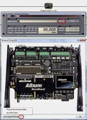 * Metoda 2: Kliknij dwukrotnie na płycie Nano-Board aby otworzyć panel NanoBoard – narzędzie konfiguracyjne płytę NanoBoard. Następnie kliknij przycisk View button aby otworzyć okno dialogowe NanoBoard Configuration. Następnie rozwiń listę Auto Configure FPGA Project i wybierz Prosty_licznik_ rewersyjny.PrjFpg (rysunek 5).