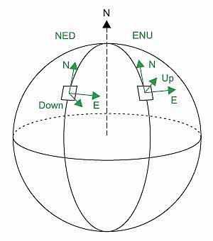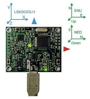 Jak wiadomo, akcelerometr służy do pomiaru przyśpieszeń, co pozwala pośrednio wyznaczyć także prędkość i zmianę położenia obiektu. Ponadto, może on służyć m.in. do określenia orientacji obiektu względem powierzchni Ziemi. Z kolei magnetometr pozwala określić orientację obiektu względem ziemskich biegunów magnetycznych. Z tego powodu jednym z podstawowych zastosowań, do których przewidziany jest opisywany układ MEMS jest nawigacja i wyznaczanie orientacji przestrzennej urządzenia, w którym został wykorzystany. W tego typu aplikacjach ważne jest zdefiniowanie wykorzystywanych globalnych i lokalnych układów współrzędnych. W przypadku układów lokalnych, w nawigacji lądowej najczęściej stosuje się układ East-North- -Up (ENU), w którym oś X wskazuje kierunek wschodni, Y – północny, a Z – w górę. Natomiast w nawigacji morskiej i lotniczej – układ North-East-Down (NED) gdzie oś X wskazuje kierunek północny, Y – wschodni, a Z – w dół, czyli do wnętrza Ziemi (rysunek 4). W programie demonstracyjnym użytkownik ma możliwość wyboru, według którego układu mają być interpretowane dane. Przyjęto przy tym, że moduł leży płasko na poziomym stole i do określania kierunku wykorzystywane są tylko osie X i Y magnetometru. Gdy przyjmiemy układ ENU i moduł leży wierzchem (stroną z układem i mikrokontrolerem) do góry, wówczas krawędź zaznaczona na fotografii 1 niebieską strzałką pokazuje kierunek wskazywany na ekranie przez igłę kompasu. Gdy z kolei przyjmiemy układ NED i moduł leży stroną spodnią do góry, wówczas kierunek wskazywany przez igłę pokazuje krawędź zaznaczona na fotografii 1 strzałką czerwoną