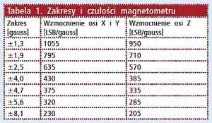Jak już wspomniano, głównym elementem modułu demonstracyjnego jest układ LSM303DLH, zawierający w sobie 3-osiowy akcelerometr (o dostępnych zakresach ±2, ±4 lub ±8 g) i 3-osiowy magnetometr (o zakresach ±1,3, ±1,9, ±2,5, ±4,0, ±4,7, ±5,6 i ±8,1 Gaussa). Ponadto układ ma m.in. możliwość wykrywania swobodnego spadku oraz zgłaszania przerwań, których źródła można konfigurować. Komunikacja pomiędzy mikrokontrolerem a układem odbywa się z wykorzystaniem interfejsu I²C. Układ wykonuje pomiary z rozdzielczością 12 bitów, a wyniki udostępnianie są w postaci słów 16-bitowych, z tym, że dane z akcelerometru wyrównane są do lewej, a z magnetometru do prawej strony słowa. Ponadto, czułość magnetometru w osi Z jest o około 10% niższa niż w osiach X i Y, co należy uwzględniać przy przetwarzaniu danych z pomiarów. Odpowiednie wartości wzmocnień podane są w tabeli 1.