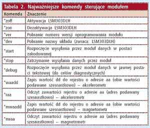Jak wspomniano, moduł można podłączyć do komputera poprzez interfejs USB i obserwować wyniki jego działania w programie Unico. Jest to jednak mało przydatne z punktu widzenia możliwości wykorzystania modułu do własnych aplikacji. Na szczęście z modułem można skomunikować się samodzielnie poprzez wirtualny port COM, a polecenia wydawane są w postaci dość prostego zestawu komend (tabela 2). Wysyłane są one w postaci tekstowej i muszą być zakończone znakiem 0x10 (r) co sprawia, że można sterować modułem nawet z poziomu zwykłego terminala. Na przykład komenda *mw000Cr oznacza zapis wartości 0x0C do rejestru magnetometru o adresie 0x00. Parametry połączenia to: szybkość 115200 bps, 8 bitów danych, baz kontroli parzystości, 1 bit stopu, bez kontroli przepływu.