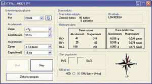 Aby zaprezentować sposób komunikacji z modułem STEVAL-MKI1063V1, napisano aplikację w języku C++/ CLI w środowisku Microsoft Visual C++ 2008 Express. Jej ekran pokazany jest na rysunku 3. Pozwala ona na skonfigurowanie parametrów pomiaru, a następnie obserwowanie danych nadchodzących z modułu. Dodatkowo, w programie zaimplementowano cyfrowy kompas z funkcją automatycznej kalibracji.