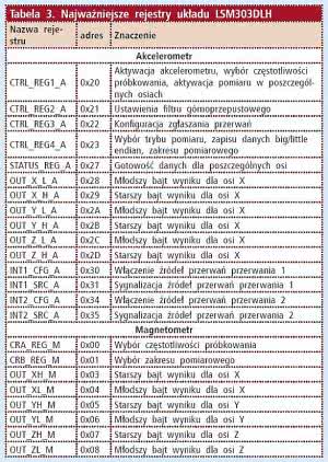 Patrząc na listę częstotliwości próbkowania dostępnych dla akcelerometru (0,5, 1, 2, 5 i 10 Hz w trybie low- -power oraz 50, 100, 400 i 1000 Hz w trybie normalnym) i magnetometru (0,75, 1,5, 3, 7,5, 15, 30 i 75 Hz) można zauważyć, że nie są one ze sobą zgodne. Powstaje więc pytanie, z jaką częstotliwością moduł będzie wysyłać dane do komputera PC. W przypadku modułu, do którego dostęp miał autor, była to częstotliwość wybrana w ustawieniach akcelerometru. Analiza kodu źródłowego firmware dostarczanego wraz z Unico wykazała jednak, że w niektórych jego wersjach wybierana jest wyższa z częstotliwości wybranych dla obu układów, co wydaje się być bardziej uzasadnionym rozwiązaniem. Niezależnie od wyboru, wysyłane pakiety zawierają zawsze komplet wartości, z tym, że dane z czujnika "wolniejszego" są kilkukrotnie powtarzane w kolejnych pakietach. Domyślna konfiguracja układu jest następująca: częstotliwość próbkowania akcelerometru 50 Hz, zakres akcelerometru ±2 g, częstotliwość próbkowania magnetometru 15 Hz, zakres magnetometru ±1,5 Gaussa. Wybór częstotliwości próbkowania wiąże się z automatycznym wyborem nastaw wewnętrznego filtru dolnoprzepustowego (antyaliasingowego). Oprócz tego, dla akcelerometru można także włączyć filtrowanie danych filtrem górnoprzepustowym, co m.in. pozwala usunąć z sygnału składową stałą. Jeżeli chcemy zmienić konfigurację układu, należy zatrzymać wysyłanie danych komendą *stop, a następnie poprzez komendy *waadd i *mwaadd ustawić odpowiednie wartości w rejestrach układu. W tabeli 3 zawarto zestawienie najważniejszych z nich.