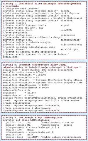 Na listingu 1 pokazano deklarację kilku zmiennych należących do klasy Form1 opisującej formularz okna programu. Zmienne te wykorzystywane są w dalszej części programu. Pierwsze trzy z nich to tablice daneS, daneP i danePKor, które zawierają, kolejno: dane "surowe", czyli odebrane z modułu STEVAL i odkodowane; dane przeliczone na jednostki fizyczne; dane przeliczone na jednostki fizyczne i skorygowane. Zmienna azymut zawiera kąt azymutu wyznaczony w celu narysowania wskaźnika kompasu. Na końcu listingu znajduje się uchwyt do zmiennej obiektowej serialPort, która jest odpowiedzialna za komunikację przez port szeregowy. Klasa SerialPort jest klasą standardową zawartą w bibliotekach środowiska .NET od wersji 2.0. Inicjalizacja większości z tych zmiennych odbywa się w konstruktorze klasy Form1 (listing 2). Z kolei na listingu 3 przedstawiono deklarację klasy LSMKonfigClass, której zadaniem jest przechowywanie aktualnego zestawu nastaw konfiguracyjnych układu LSM303DLH.