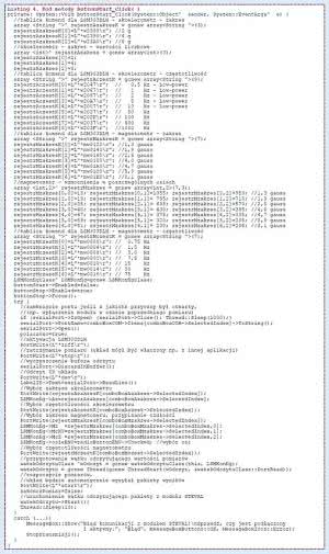 Dwa główne elementy kodu programu to klasa watekOdczytuClass oraz metoda z klasy Form1 o nazwie buttonStart_ Click(). Metoda ta jest wywoływana po naciśnięciu przez użytkownika przycisku Start. Realizowane w niej polecenia mają za zadanie przygotować transmisję z i do modułu STEVAL-MKI063V1, wykonać konfigurację układu LSM303DLH, a następnie rozpocząć zasadniczą część transmisji, czyli uruchomić wątek programu odpowiedzialny za odbiór danych pomiarowych.