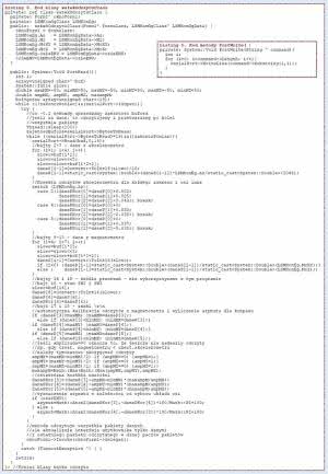 Najważniejszą częścią klasy jest metoda PortRead( ). Rozpoczyna się ona od sprawdzenia, czy w buforze odbiorczym portu jest co najmniej 19 bajtów danych. Wartość ta wynika z długości pojedynczego pakietu danych. Jeśli w buforze jest wystarczająca liczba znaków, rozpoczyna się ich odczyt pakiet po pakiecie. Następnie wykonywane jest dekodowanie (wyniki zapisane w tablicy daneS) i przeliczenie odczytanych danych na fizyczne wartości przyśpieszenia i natężenia pola magnetycznego (wyniki zapisane w tablicy daneP). Kolejną wykonywaną operacją jest wprowadzenie korekt kalibrujących odczyty. W przypadku akcelerometru korekty te zostały wyznaczone off-line, tzn. zaobserwowano wskazania akcelerometru w poszczególnych osiach i na stałe zapisano odpowiednie wartości korygujące w kodzie programu. W przypadku magnetometru zastosowano procedurę automatycznej kalibracji.