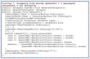 Ostatnim zadaniem wykonywanym w metodzie PortRead( ) jest wywołanie, poprzez delegata, metody aktualizującej interfejs użytkownika, tj. wyświetlającej odczytane wartości i rysującej wskaźnik kompasu oraz pola symbolizujące stan przycisków SW2 i SW3. Aktualizacja wykonywana jest przez metodę UpdateUI( ). W systemie Windows dostęp do kontrolek interfejsu ma tylko wątek, w którym zostały one utworzone, i dlatego wątek odczytu nie może tego robić bezpośrednio. Stąd potrzeba delegacji metody UpdateUI( ). Kod tej metody pokazany jest na listingu 7. Listingi 7 i 2 zawierają także pozostałe elementy związane z delegowaniem metody.
